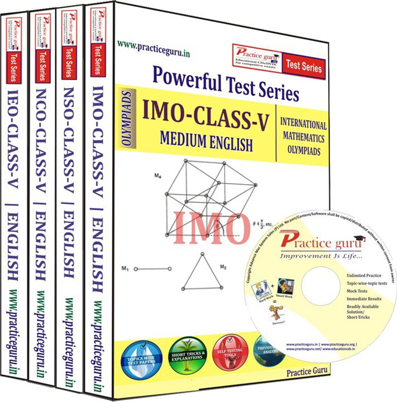 IMO CLASS V Number Sense, Computation Operations, Fractions, Money, Measurement of Quantity, Length, Weight, Time and Temperature, Geometry, Pictorial Representation, Patterns, Symmetry & Pictorial IEO CLASS V Word and Structure Knowledge, Prepositions, Tenses, Irregular verbs, Pronouns, Modals quantifiers, Spellings, Collocations, Phrasal verbs, Idioms, Homonyms and homophones., Words related to feelings, Travel, Food, Health, appearance, Character, Reading, Search for and retrieve information from various text types like news headlines, Messages, Letters, Understand information given in News reports, Time tables, Messages, Acquire broad understanding of and look for specific information in short texts like messages, menu card, Spoken and Written Expression, Ability to understand situation-based variations in functions like requests, Refusals apologies, The use of conjunctions. NSO CLASS V Mental Ability, Number Sense, Regional and Roman Numerals, Numbers up to Lakhs, Multiples and Factors, Fractional, Numbers, Addition, Subtraction, multiplication, division, Decimals, Geometrical Shapes and Angles, Symmetry, Measurement of Length, Money, Weight, Perimeter and Area of Square, Rectangle and Circle, Pictorial Representation of Data, HCF and LCM, Problems Based on Figures, Odd One Out, Series Completion, Coding-Decoding, Mathematical, Reasoning, Mirror Images, Embedded Figures, Alphabetical Test, Science, Animals, Plants and Food, Human Body and Health, Water, Matter, Natural Resources and Calamities, Earth and Universe, General Science NCO CLASS V Mental Ability, Number Name and Number Names (4 digit numbers), Addition, Subtraction, Fractions, multiplication, division, time, Temperature, Straight and Curved Lines, Calendar, Measurement of Length, Weight and Capacity, Geometrical Shapes, Money, Logical and Analytical Reasoning, Problems Based on Figures, Odd One Out, Series Completion, Coding-Decoding, Mathematical Reasoning, Analytical Reasoning, Mirror Images, Embedded Figures, Computers and IT, Fundamentals of Computer, General Information about Computers, Storage Devices, Parts of ComputerUses of Computer, Input and Output Devices, Introduction to Internet, MS-Paint, Introduction to MS-Word, Latest Developments in the field of IT Additional Features!1. Runs without Internet!2. Immediate scores and solutions!3. Compatible with Windows XP/7/84. Online support,5. Complete career planner chart with PDF files containing relevant details.6. Fun games for brain exercise7. Previous year papers in PDF format also, for print out facility!8. Random questions in a test every time you practice!