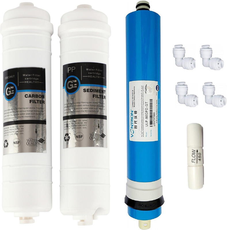 PUROSMART trusted and supreme quality products…..This kit contains 1 pcs Sediment Filter which stops the hard impurities at the initial stage to prevent further filters and makes their life longer,1 pc Carbon Filter to removes Bad odor, chlorine,80 GPD Vontron membrane Rejects wide spectrum of impurities down to .0001 micron. 50 gallons per day – production rate under ideal conditions 95-97% rejection rate. This quality Reverse Osmosis Membrane is widely used on household water purifiers, aquariums, and other small-sized commercial water purifying devices,4 pcs Elbow connectors for easy installation…PUROSMART products give healthy and pure water to their customers.