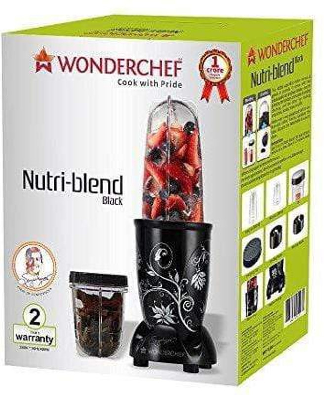 Performance with Style: India’s favourite Mixer-Grinder-Blender, Nutriblend, is the perfect combination of superior performance and superb styling that adds beauty to your kitchen Powerful Motor: The compact yet powerful machine grinds the toughest of chutneys and masalas, and ensures nutrition extraction from all fruits and veggies thanks to its incredibly high speed of 22,000 RPM, which is almost twice that of normal mixer-grinders Transparent & Unbreakable Jars: Polycarbonate jars actually let you see whats inside, so you dont need to keep opening up the lids to see whether your job is done or not All in One: You can keep adding jars, chopper, juicer and food processor attachments to your Nutri-blend. All are available on our website Hands-Free operation: Best thing is you dont need to keep your hand on the lid during operation, for the fear of it flying off. This is because Nutriblend has the unique inverted design that has the lid screwed safely at the bottom with zero chance of the food spattering out Stainless Steel Blades: Super quality surgical stainless steel blades are able to grind everything and stay sharp despite working at high speeds. They extract every ounce of immunity enhancing anti-oxidants, pain relieving Omega 3s, proteins, vitamins & minerals from your foods Specialised Functions: The Long Jar (500ml) comes with 4-wing blade for mixing-blending and the Short Jar (300ml) with 2-wing flat blade for grinding to make all kinds of chutneys, shakes, smoothies and masalas. Two useful lids for storing and sprinkling come with the product Grind everything within 30 seconds: The speed-breakers inside the jars ensure proper grinding of even the hardest spices, ensuring smoother chutneys and more finely ground masalas than any other grinder. You can grind even a single piece of kaali mirch (peppercorn), so effective is the performance Plug n Play: Its real beauty lies in its simplicity – there are no speed switches – just plug and play. Since the jars are transparent, you can control the end result by deciding when to stop. This also saves you from repeated hassles of the switches giving trouble Trademark Design: The attractive trademark flower design stands apart and is a symbol of health and quality. Its a reflection of your refined taste in the kitchen Easy to clean: Cleaning is super-easy because the blades are right on top when you unscrew the jar-base, unlike in normal mixers where the blades are at the bottom of the jar