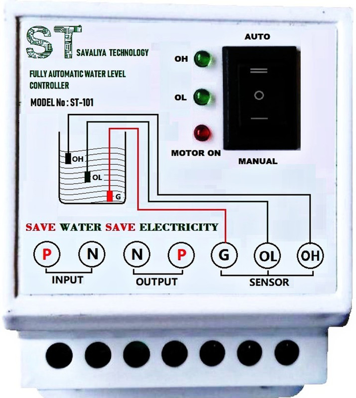 Working : As shown in the above diagram out of three sensors, 1 sensor put at the bottom, 1 sensor put at middle, and 1 sensor at top level of the tank. When the water level in the tank becomes low, means water get down from middle sensor, motor get switch on automatically. The tank starts filling up. When the water level reaches to the higher level, the top level sensor sense. the motor automatically gets switched off. No Man power is required. Supply voltage : 220-270 V AC, Suitable up to 1HP Motor. Also suitable for single phase MCB starter panel & submersible motor. Auto and manual switch available. Sensing Elements: Corrosion Free Sensors, so that it is free from oxidation,Long life