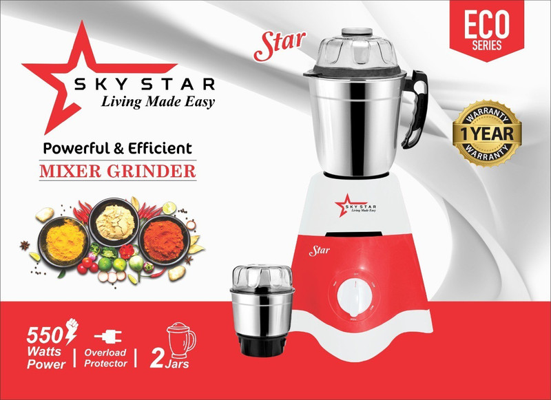 SKYSTAR, THE MIXER COMES WITH THE EFFECTIVE 550 WATT POWERFULL MOTOR, BEST FOR YOUR KITCHEN TO SOLVE ALL YOUR MIXING AND GRINDING NEEDS IN ALL SEASONS. THIS MIXER GRINDER FEATURES 2 STAINLESS STEEL JAR. IT IS AN EXCELLENT CHOICE FOR YOUR KITCHEN , WITH ITS TWO MULTIPURPOSE JARS, MAKES COOKING CONVENIENT, IT TAKES LESS TIME FOR CONSUMPTION. THE MOTOR COMES WITH ONE YEAR OF MANUFACTURER WARRANTY.