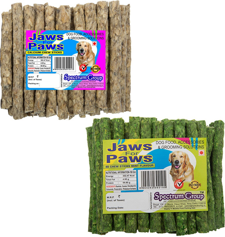 Spectrum Group-Pet Food and Accessories Division brings for your pampered Pet Money Saver Combo Pack with Calcium + Mint Munchies also known as Chew Sticks, Qty 40+40 Sticks or 450+450 g depending upon the lot manufectured. These sticks are available in Chicken, Mutton, Calcium and Natural Flavors single and in Money Saver Combo Packs. Munchies are used for Holistic Nutrition for your Four Legged Love. These sticks are said to build immunity and keep your pet healthy and cheerful so that you spend more and more moments of love & play with the Pet. These sticks are ideal for all breeds of adult dogs. Our stringent quality checks coupled with ISO approved processes ensure that you will get optimum quality products that has passed through stringent quality test parameters defined by HACCP and ISO 9001:2015. Spectrum Group is one stop shop solution for all Pet needs from Fashion Apparals, Accessories, Pet Security items, Pet food,Pet Nutrition & Pet Hygiene products like Hair Care, Skin Care & Oral Care, along with wide range of Toys and Play items.