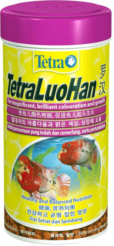 Tetra LuoHan suitable for feeding not only FlowerHorn, but also other large predatory cichlids, such as Astronotus, large Acar and, of course, tsihlazomy. In the stern contain large amounts of animal protein and fat. In developing TetraLuoHan Large Pellets were taken into account all the features of the diet, as well as the need to maintain and strengthen their bright attire. Not by chance it includes a large amount of seafood, including krill, rich astoksantinom (natural red dye). Do not forget the developers and a range of vitamins, fish provide a powerful immunity, and therefore good health.