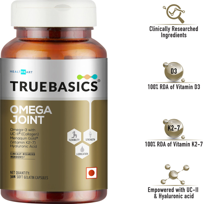 TrueBasics Omega Joint contains scientifically proven ingredients like UC-II and Menaquin Gold (Vitamin K2-7) that are found to be safe and effective. TrueBasics Omega Joint is empowered with UC-II collagen, which is scientifically proven in modulating joint discomfort. Vitamin K2-7 in TrueBasics Omega Joint may optimize calcium use in bone formation and prevents calcium deposition in blood vessels. TrueBasics Omega Joint contains 100% RDA of Vitamin D3 & Vitamin k2-7, which may help in maintaining bone integrity by improving calcium absorption.