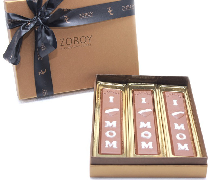 A smart chocolate box with 3 chocolate bars saying “I love Mom”. Bars assortment contains Milk chocolate, Bar with Nuts and a Dark chocolate
