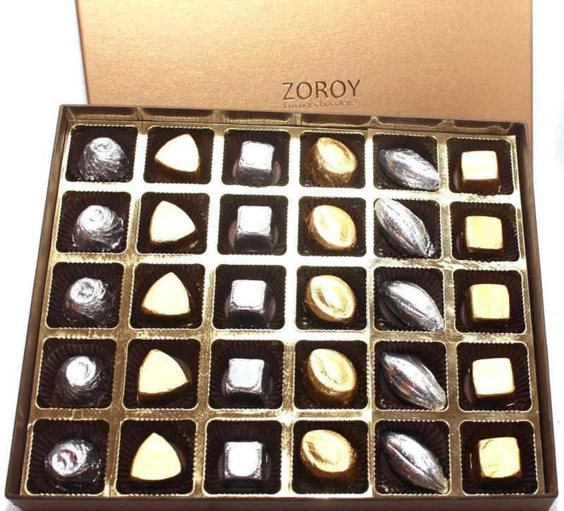 This Luxury Red gift of 30 (330 gms) chocolates box is the ideal way to discover the amazing chocolate creations of Zoroy. Box contains an assortment of almond cashew, milk orange, dark, krispies, caramel crunchy and rich chocolate delight. An elegant gift anytime ! Our Red box has chic foiling of our monogram and comes wrapped in our couture brown satin ribbon.
